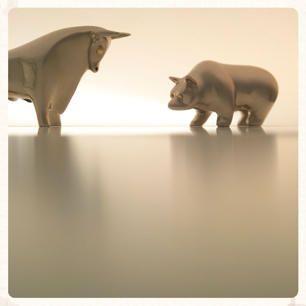 Der Bulle an der Börse steht für einen Aufwärtstrend, weil er mit den Hörnern von unten nach oben stößt. Im Gegensatz dazu greift der Bär mit seinen Pranken von oben nach unten an, also eine Abwärtsbewegung.