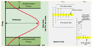 Preis, Zeit und Volumen bestimmen die Bewegungen am Markt und stellen somit die Bewegungen des Handels grafisch dar. MP basiert auf der Normalverteilung, wobei sich 70% der Werte innerhalb der 1.
